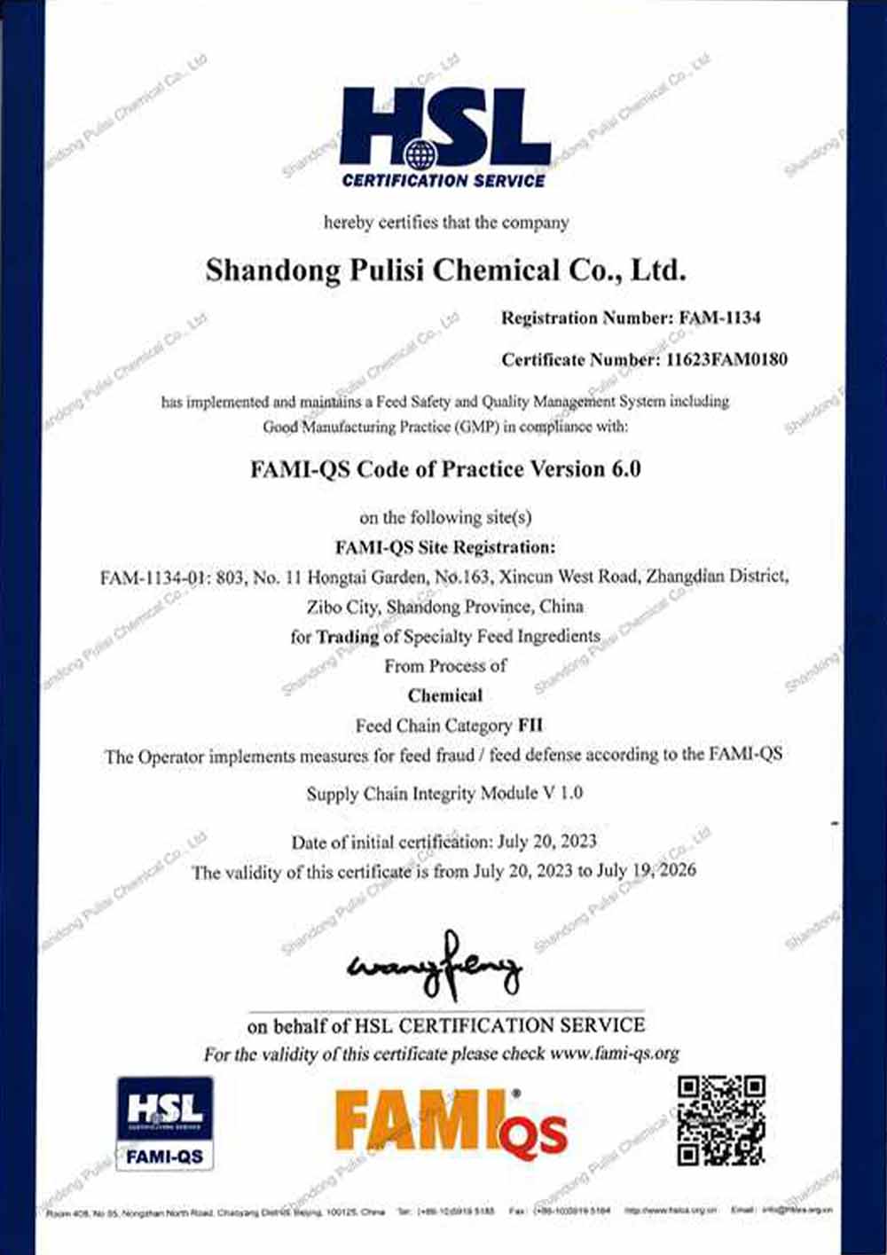 Продукция прошла сертификацию и испытания SGS,BV,FAMI-QS и другие. Компания внедрила стандартизированное и стандартизированное корпоративное управление, а также получила сертификат системы управления качеством ISO9001:2015 и немецкий сертификат BV. В 2018 году местное правительство присвоило нам почетное звание «передовая единица экспортной экономической деятельности»; в 2018 году мы получили звание демонстрационной базы северного региона алибаба; в 2019 году мы получили звание «Отличное предприятие добросовестности» в городе зибо,В 2022 году муниципальные власти выбрали его как «предприятие с выдающимся вкладом» в качественное развитие Цзыбо.
